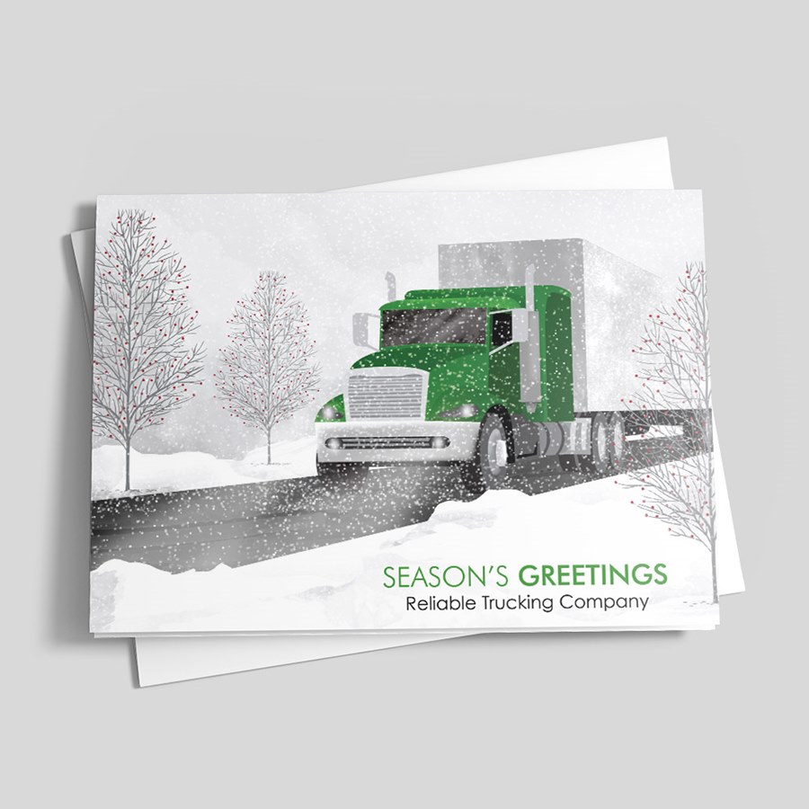 Your holiday cards will get noticed with artwork featuring a green semi making a run on these trucking Christmas cards.