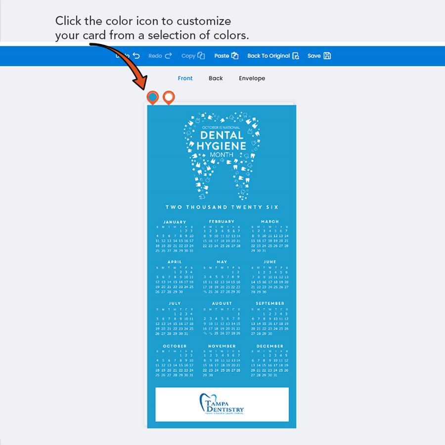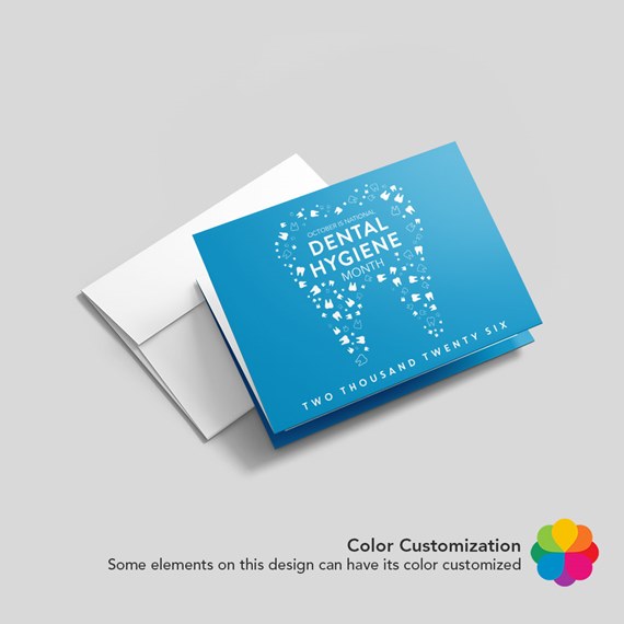 This dental-themed calendar features the year 2025, a tooth, and a Dental Hygiene Month reminder at the top in white on a sky-blue background. The days and months are displayed below. Choose from different paper types, sizes, and envelopes, then add your free personalization. Want to have your personalized calendars mailed to your recipients for you? Click 'Addressing + US Stamp + Mail' under the 'Addressing' tab when making your selections.